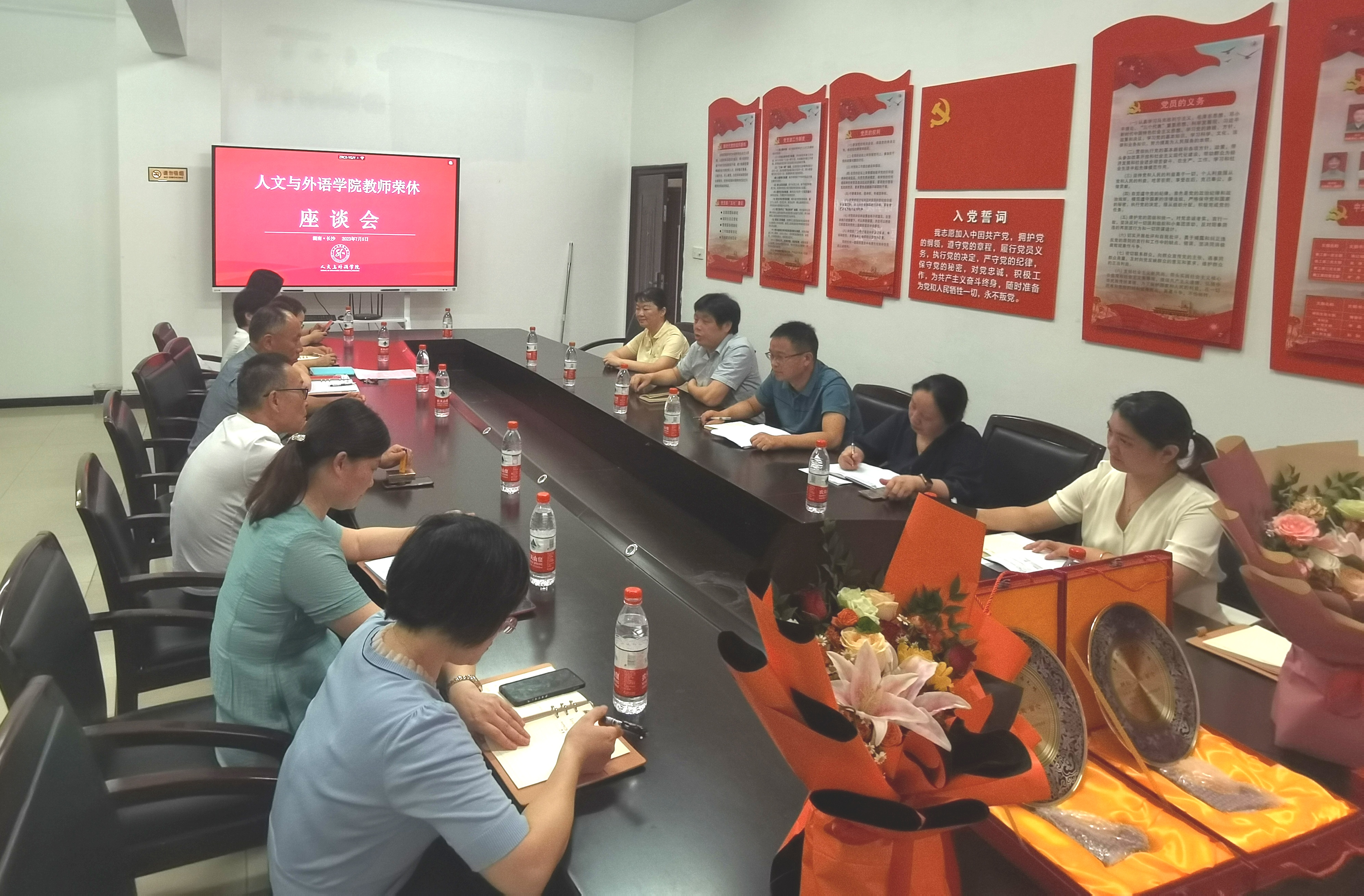 最后,公司领导分别为退休教师送上鲜花、公司特制的珐琅纪念盘和退休慰问品,并合影留念。