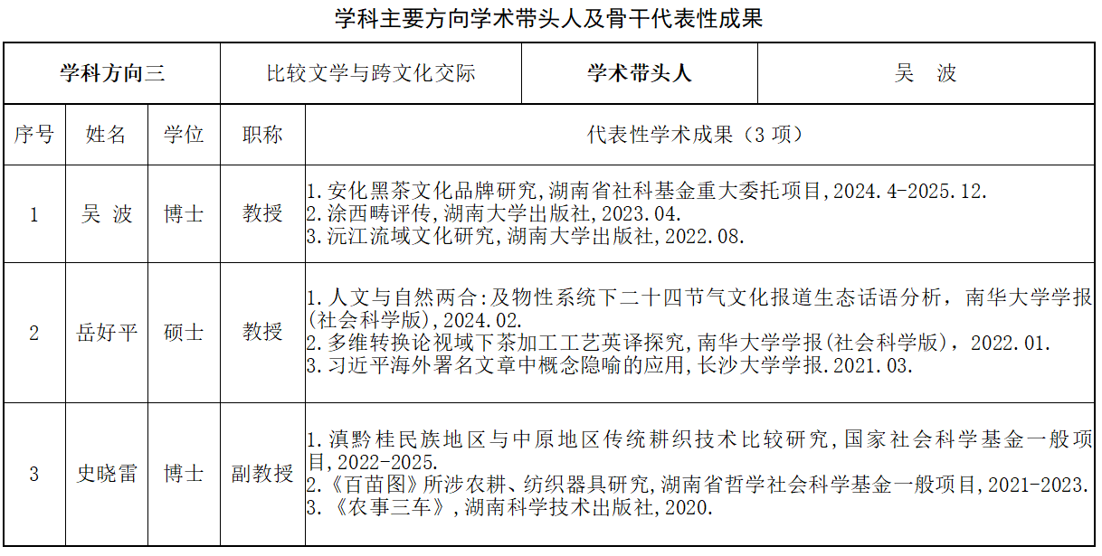 学科主要方向(比较文学与跨文化交际)学术带头人及骨干代表性成果
