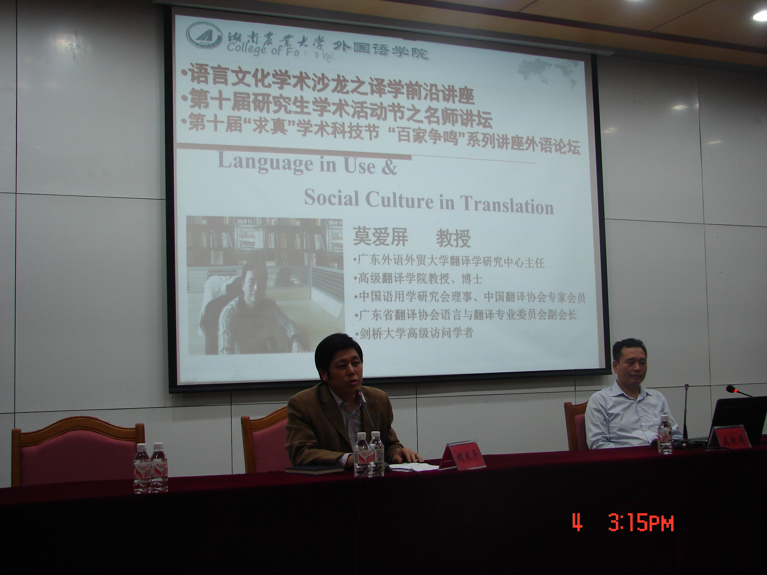 11月4日下午3点,广东外语外贸大学翻译学研究中心主任,莫爱屏教授应邀来公司讲学,在八教学海厅做了题为“Language in Use and Social Culture in Translation”的讲座。这也是继香港浸会大学谭载喜教授讲座之后,公司“语言文化学术沙龙之译学前沿讲座”和“第十届研究生学术活动节名师讲坛”以及“第十届‘求真’学术科技节 ‘百家争鸣’系列讲座”迎来的又一位翻译界知名学者。公司广大师生聆听了此次讲座,并吸引了其他院系部分教师和员工。