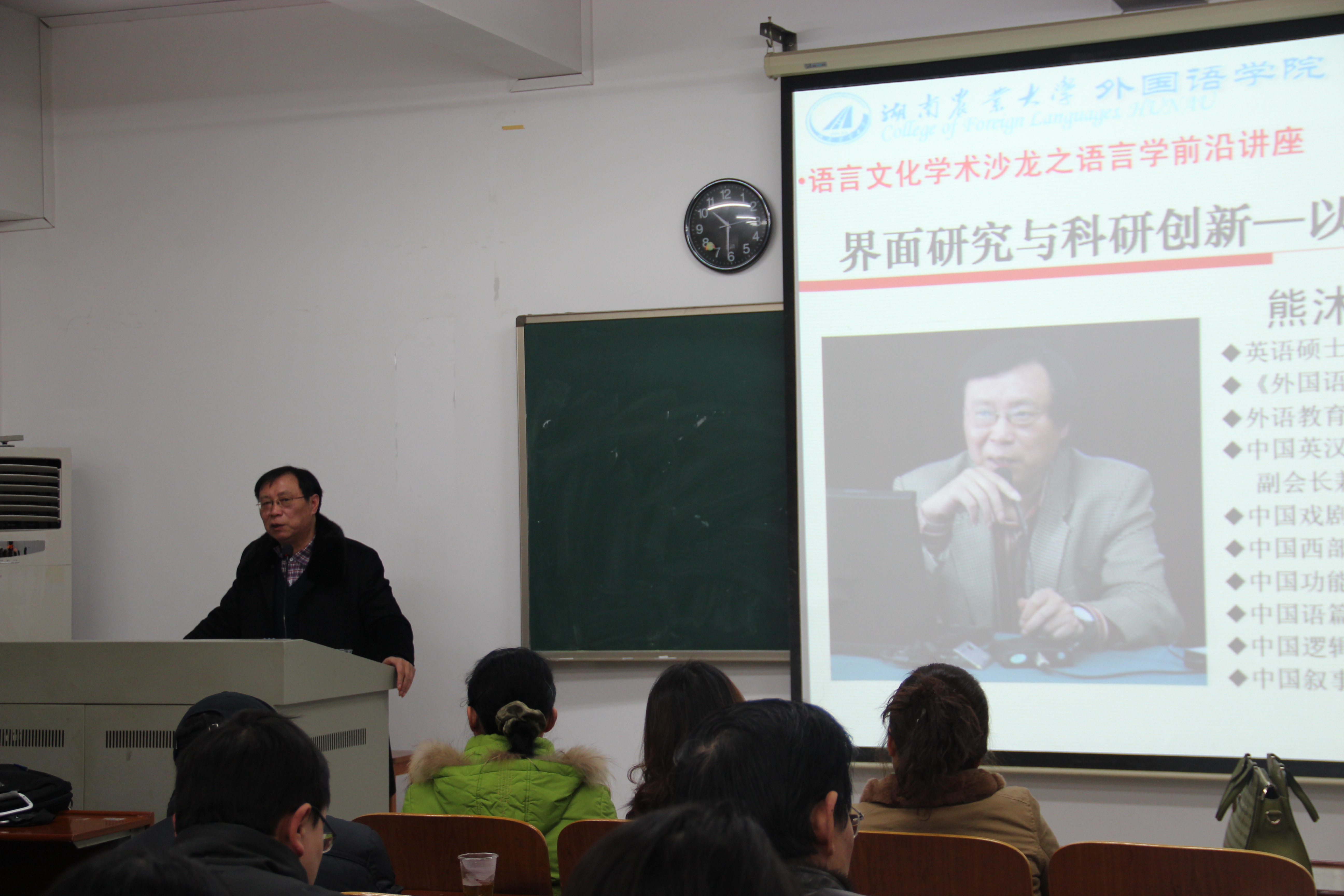 12月26日上午, 公司“语言文化学术沙龙”特邀四川外语公司熊沐清教授和胡安江教授来校讲学,讲座在九教学楼北410教室举行,由公司经理胡东平教授主持。
