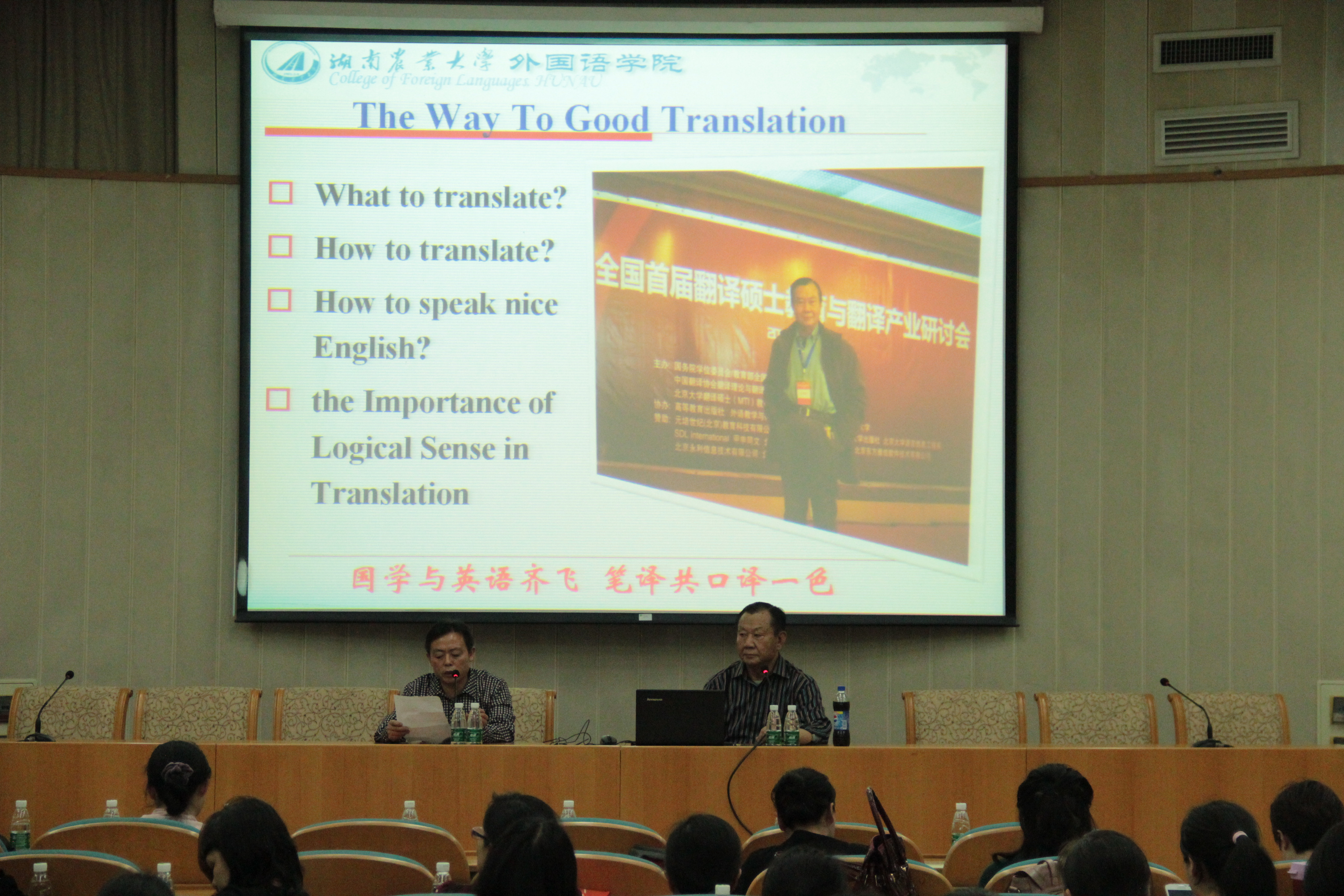 2014年4月10日下午4:00,著名翻译教育家萧兆华教授应邀来校讲学,在校生命科学楼国际会议厅以“The Way To Good Translation”为题,解析翻译的艺术。此次讲座由外国语公司副经理张玉上副教授主持,同时也拉开2014年公司第十三届研究生学术活动节外语名师讲坛和公司语言文化学术沙龙之译学前沿讲座的序幕。