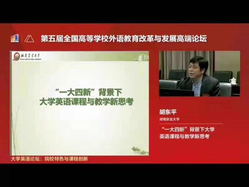 2021年3月20日下午,mksport体育胡东平经理应邀参加了第五届全国高等公司外语教育改革与发展高端论坛,并在专题论坛“院校特色大学英语课程建设”中做了《“一大四新”背景下大学英语教学与课程新思考》的专题报告。