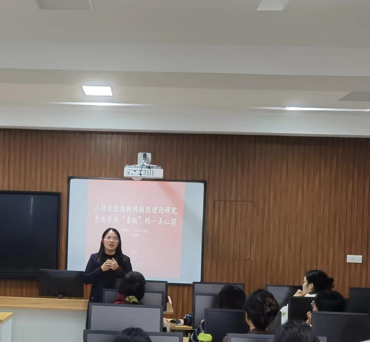 何贞慧博士作了题为“汉语致使结构制图理论研究兼谈学术"青椒"的一点心得”的报告。她结合自身的研究,从学术论文的写作、研究成果以及国际期刊的投稿等方面进行了阐述,分享了基于自己科学研究的感悟心得。何博士深入浅出地介绍了制图理论(Cartographic Approach)的研究背景、前人观点及其发展历程,同时,阐述了如何从前人文献的研究中发现学者的研究基点,并在制图理论指导下对汉语致使结构的生成和转化进行精细的句法刻画,从而开启一种全新的研究思路和视角。何博士指出做学术研究应学会读文献,追根溯源,发现研究留白,挖掘问题,善思多写,不断地积累,提升做学问的能力。