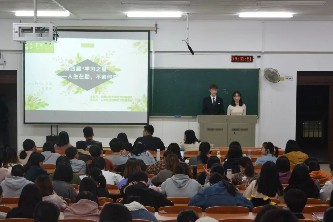 由主持人介绍比赛规则和播放往届学习之星激励视频后比赛正式开始。参赛选手们为大家带来了精彩的演讲,展现出了自我风采,充分调动了观众的热情,使现场气氛高涨了起来。在比赛中,17级英语2班的宋可欣通过围绕质、量、度三个方面抛出话题,用生动的比喻告诉了同学们学习英语的“三把利器”——计划本、英美剧、学习伙伴。18级英语2班的朱思阳向同学们展示了自己过去一年的学术和工作兴趣类奖项,告诉同学们“兴趣是最好的老师”。她还呼吁同学们要传递正能量,接收正能量,发挥榜样的力量。来自19级英语6班的张灵分享了自己的高中与数学抗争并最终取得胜利的经历,她鼓舞同学要有克服困难的勇气,终能获得成功。