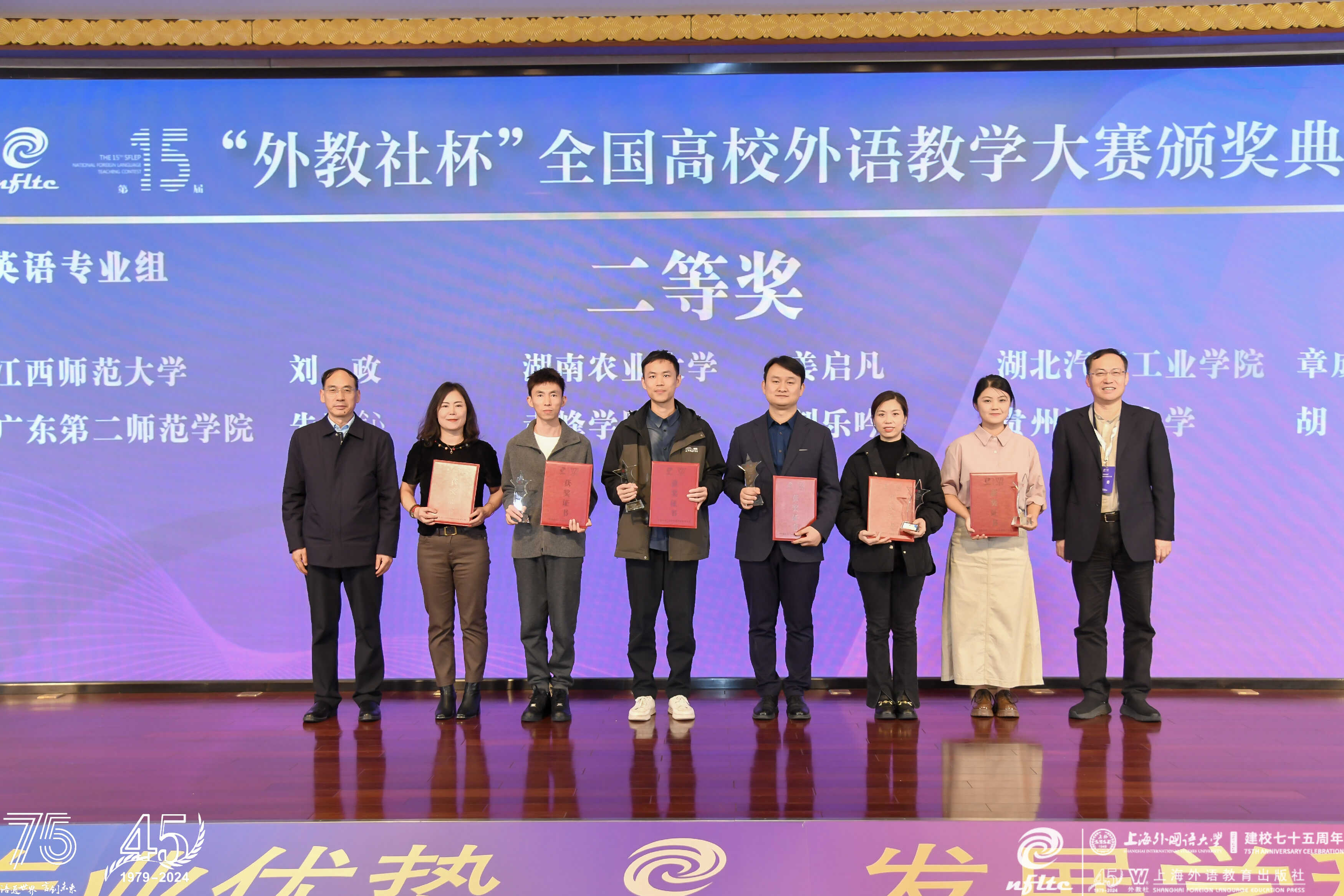 此次大赛共有来自全国30个赛区的选手激烈角逐,经过决赛和总决赛两个赛程及授课、说课、回答评委问题三个环节,共产生特等奖1人,一等奖3人,二等奖6人,三等奖若干。mksport体育英语系专业教师姜启凡老师以湖南省第一名特等奖成绩进入决赛,为湖南省唯一一个代表英语专业组的选手。在全国决赛阶段,姜启凡老师凭借扎实的语言功底、深厚的人文素养、精彩的授课表现,以决赛排名第三的成绩入围总决赛,并最终以全国第六名的成绩获得总决赛二等奖,姜启凡、范丽群、高贝、彭佳宇、陈颖等组成的团队获得英语专业组教学设计全国三等奖,实现公司在该项赛事上的突破。