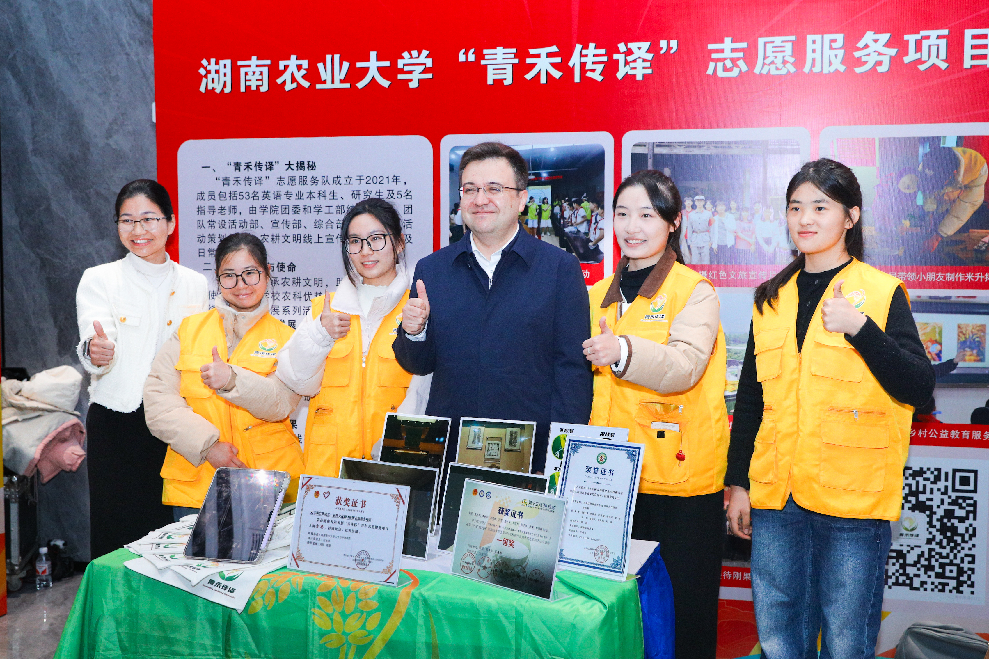 3月3日上午,湖南共青团“雷锋家乡学雷锋”百万青少年志愿服务实践育人行动现场会在湖南省农业科公司岳麓山实验室举行,“青禾传译”志愿服务队作为MK体育唯一一支志愿队参加现场会。在志愿服务深度体验营环节,团中央书记处书记夏帕克提来到“青禾传译”志愿服务队体验展台,认真听取了团队事迹汇报,给予“青禾传译”志愿服务队高度肯定并与团队志愿者合影留念。