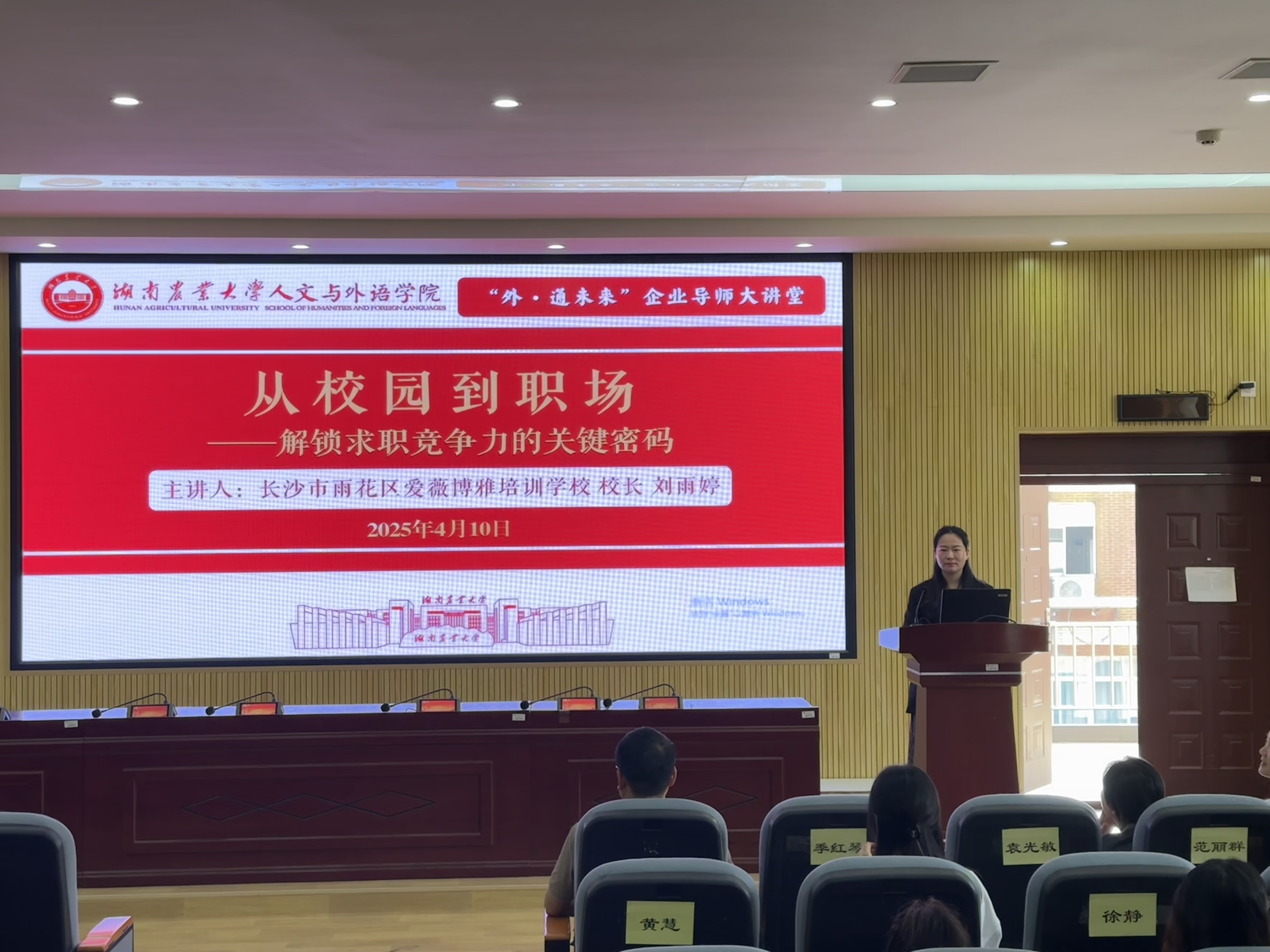 为创新人才培养机制,深化校企协同育人实效,4月10日,MK体育在第九教学楼南502会议室举办“外·通未来”就业指导系列讲座(第一期)与企业导师聘任仪式。长沙市雨花区爱薇博雅培训公司董事长刘雨婷受聘为公司企业导师,并担任本期讲座主讲嘉宾。公司党委书记袁光敏、副经理范丽群、副书记刘燕娟及就业专干和百余名研究生、本科生共同参与。
