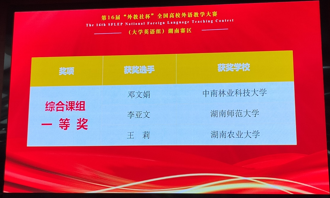 本届大赛于2025年6月21日至22日在中南林业科技大学举行,分为复赛和决赛两个阶段。在21日的复赛中,来自全省高校的大学英语综合组17名选手和听说组12名选手同台竞技,最终综合组6人、听说组4人成功晋级决赛。王莉老师团队在激烈的角逐中脱颖而出,以扎实的专业功底、创新的教学设计和从容的现场表现赢得评委高度认可,最终在决赛中斩获一等奖。